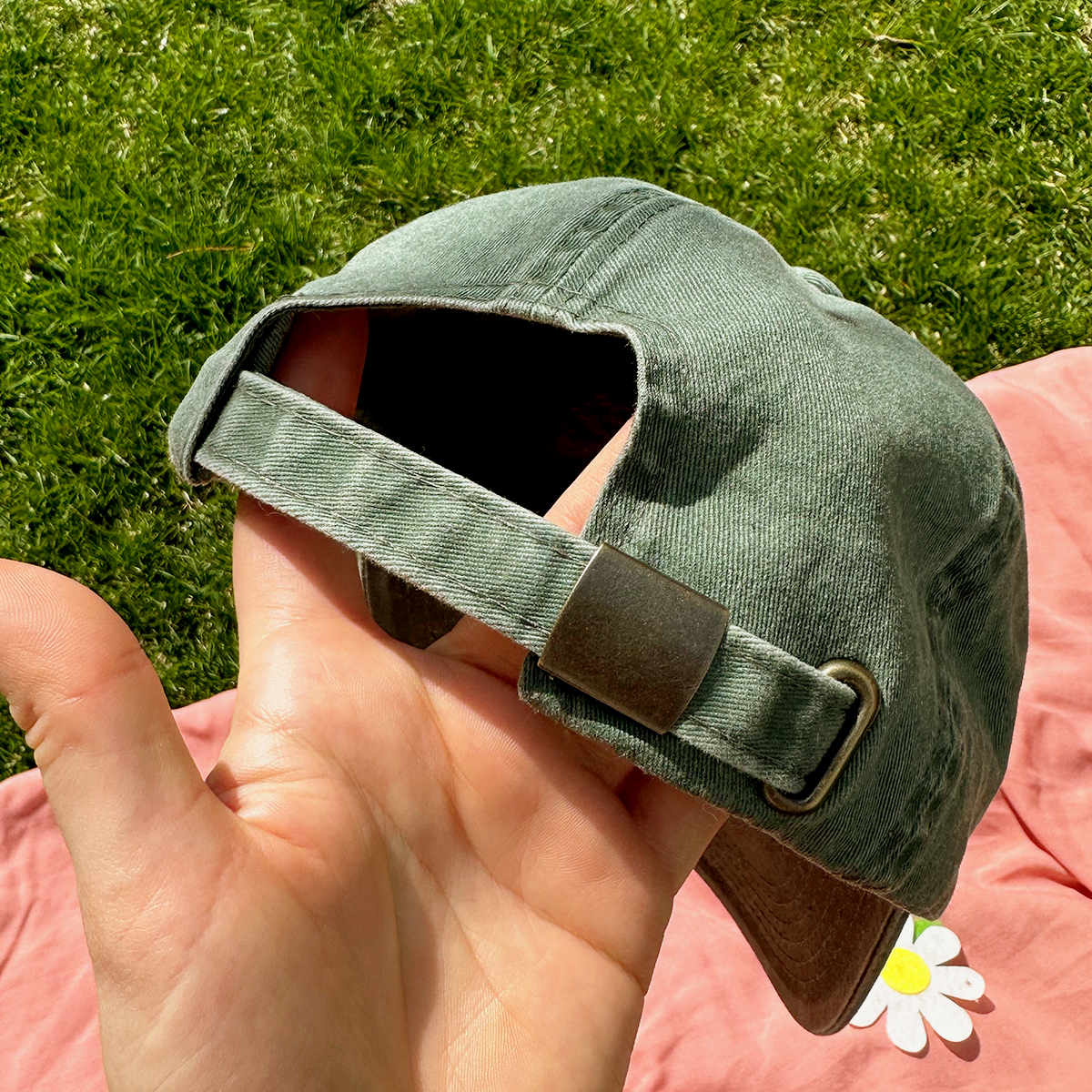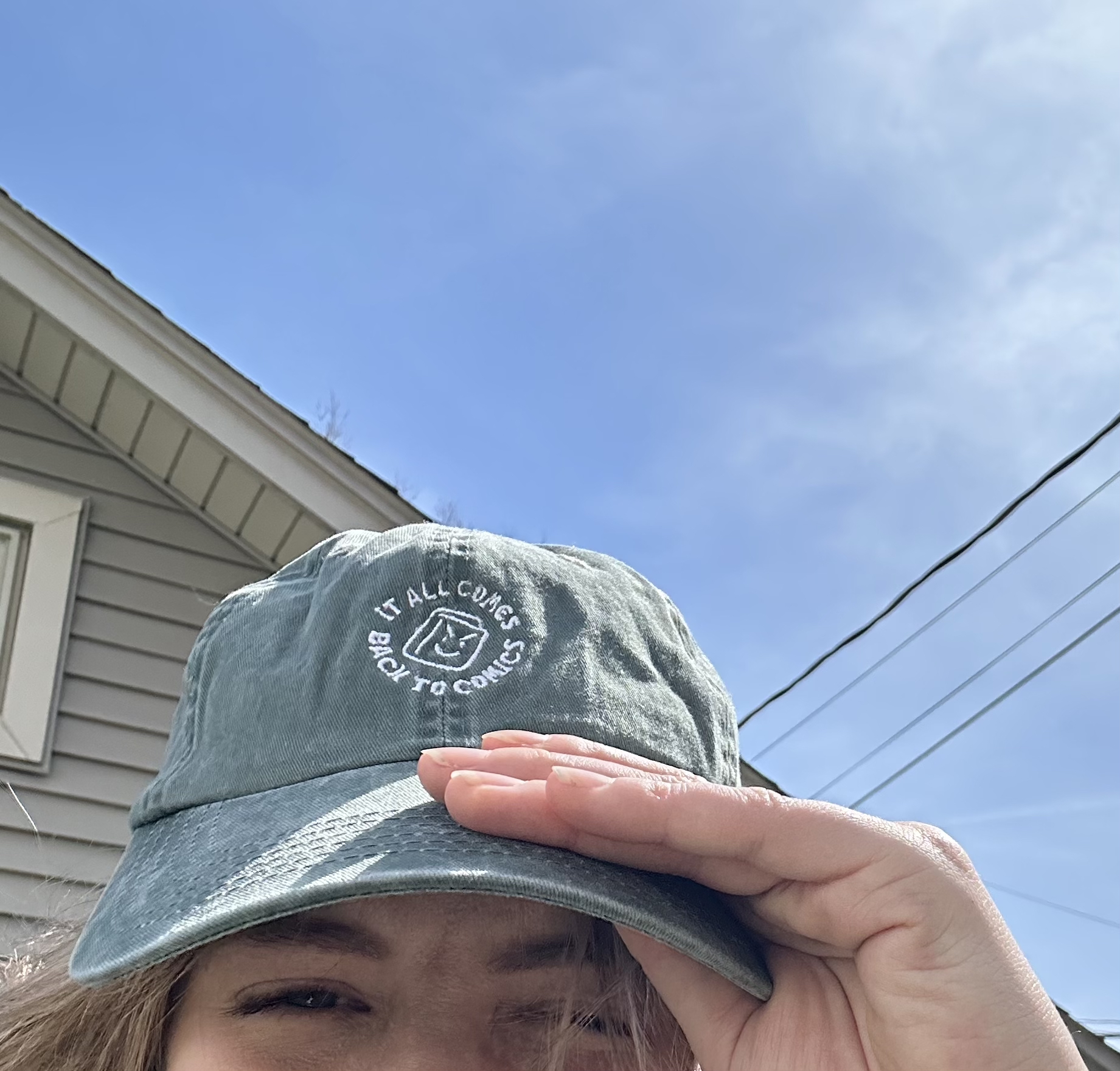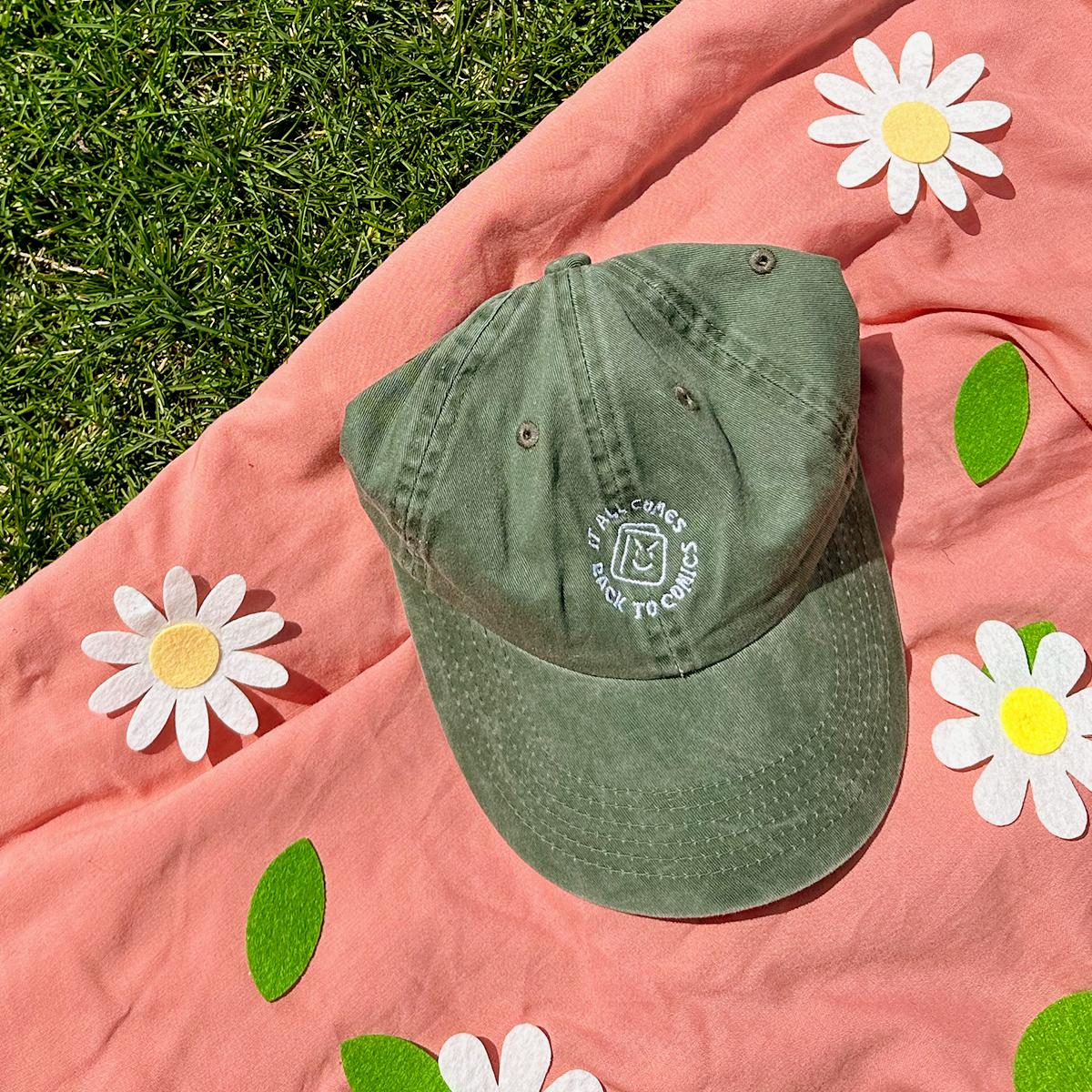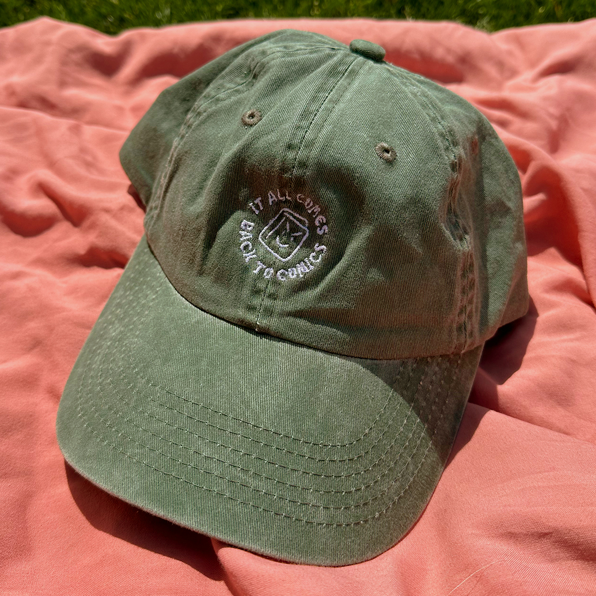 "It All Comes Back to Comics" Dad Hat — white embroidery on green, garment washed cap. 100% garment-washed cotton twill material, and adjustable back buckle.